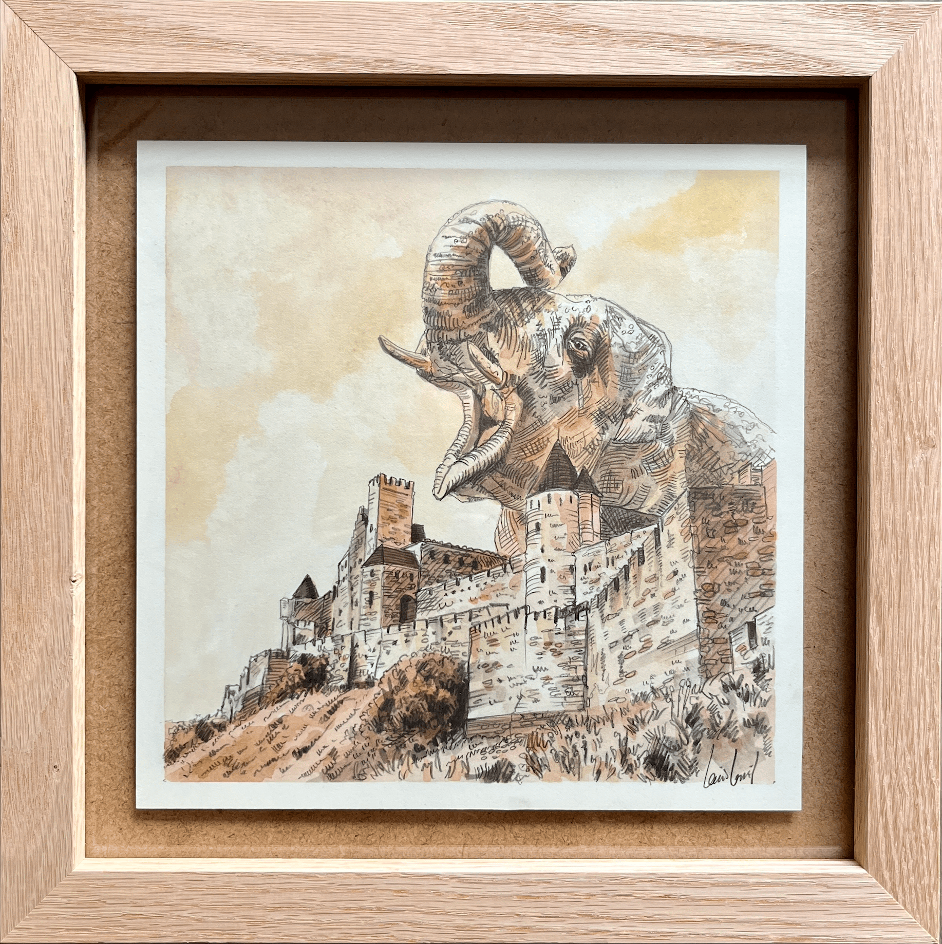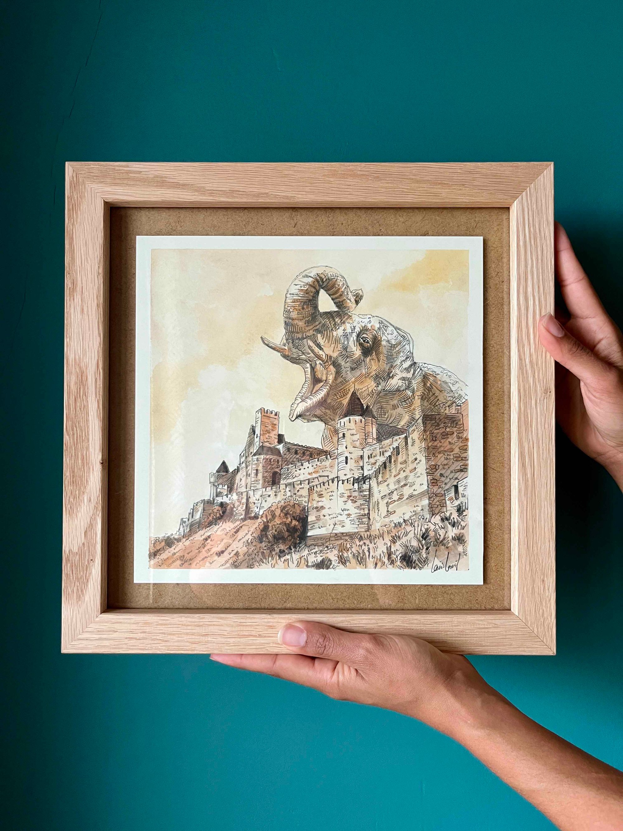 Œuvre originale fait main à l’aquarelle, crayon et feutre alcool avec cadre bois et verre.