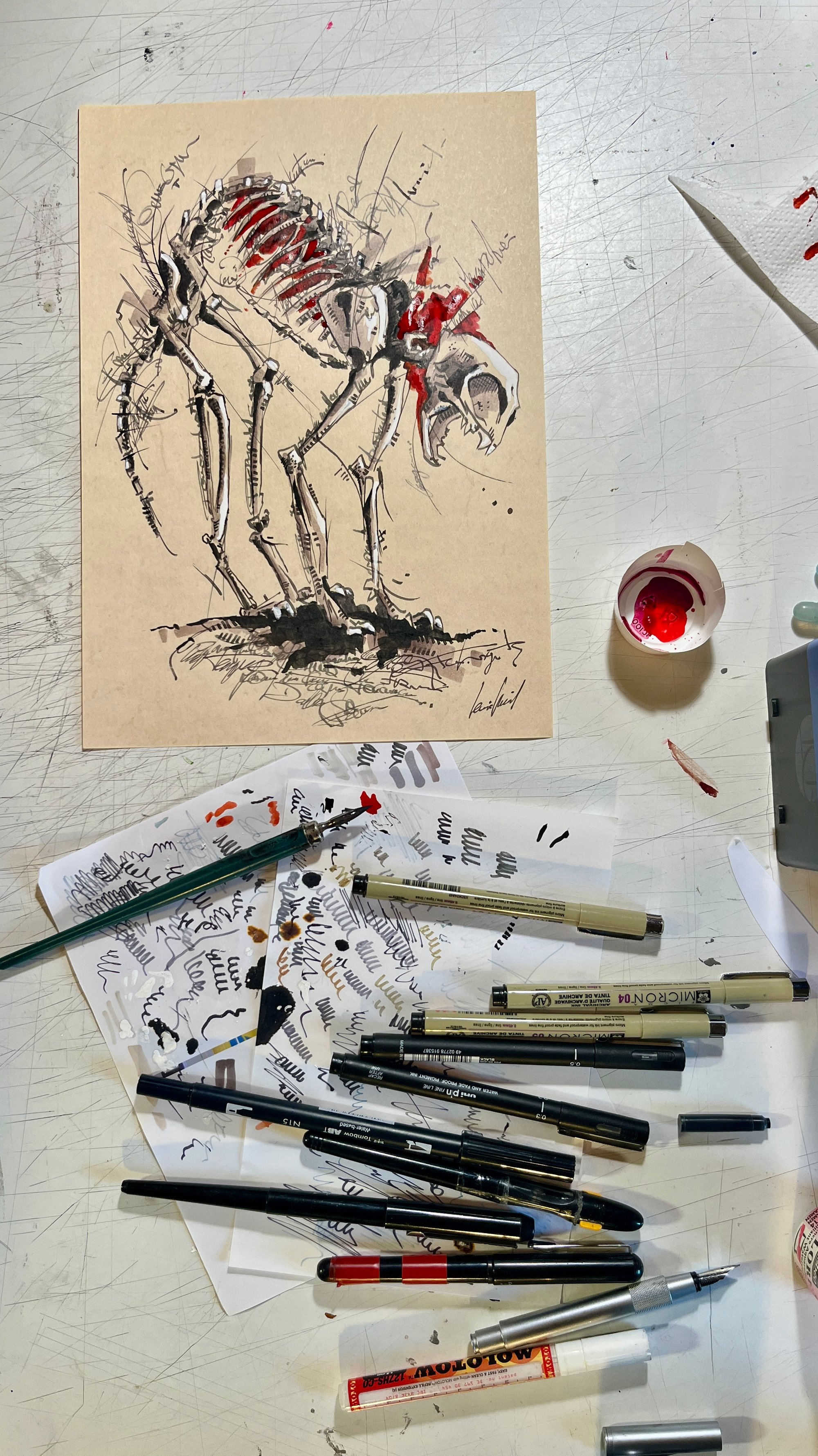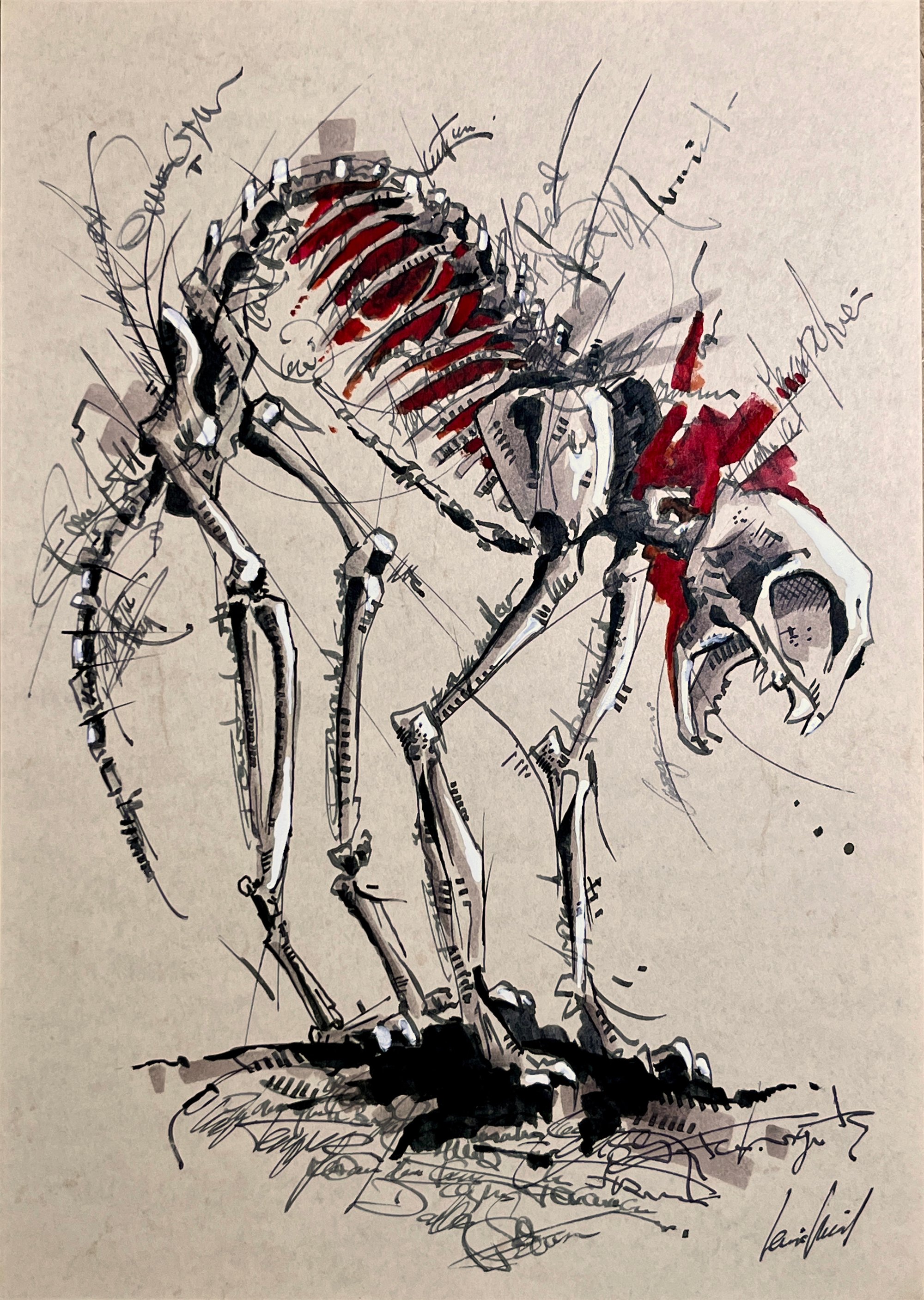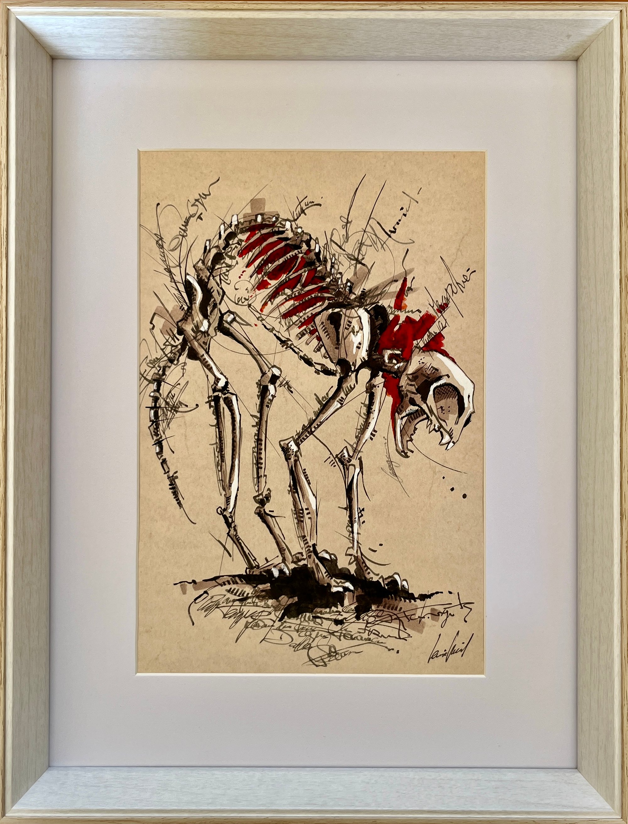 Le Chat (Squelette) Œuvre originale fait main à la plume, encre et feutres alcool sur papier à lettre avec cadre bois et verre.