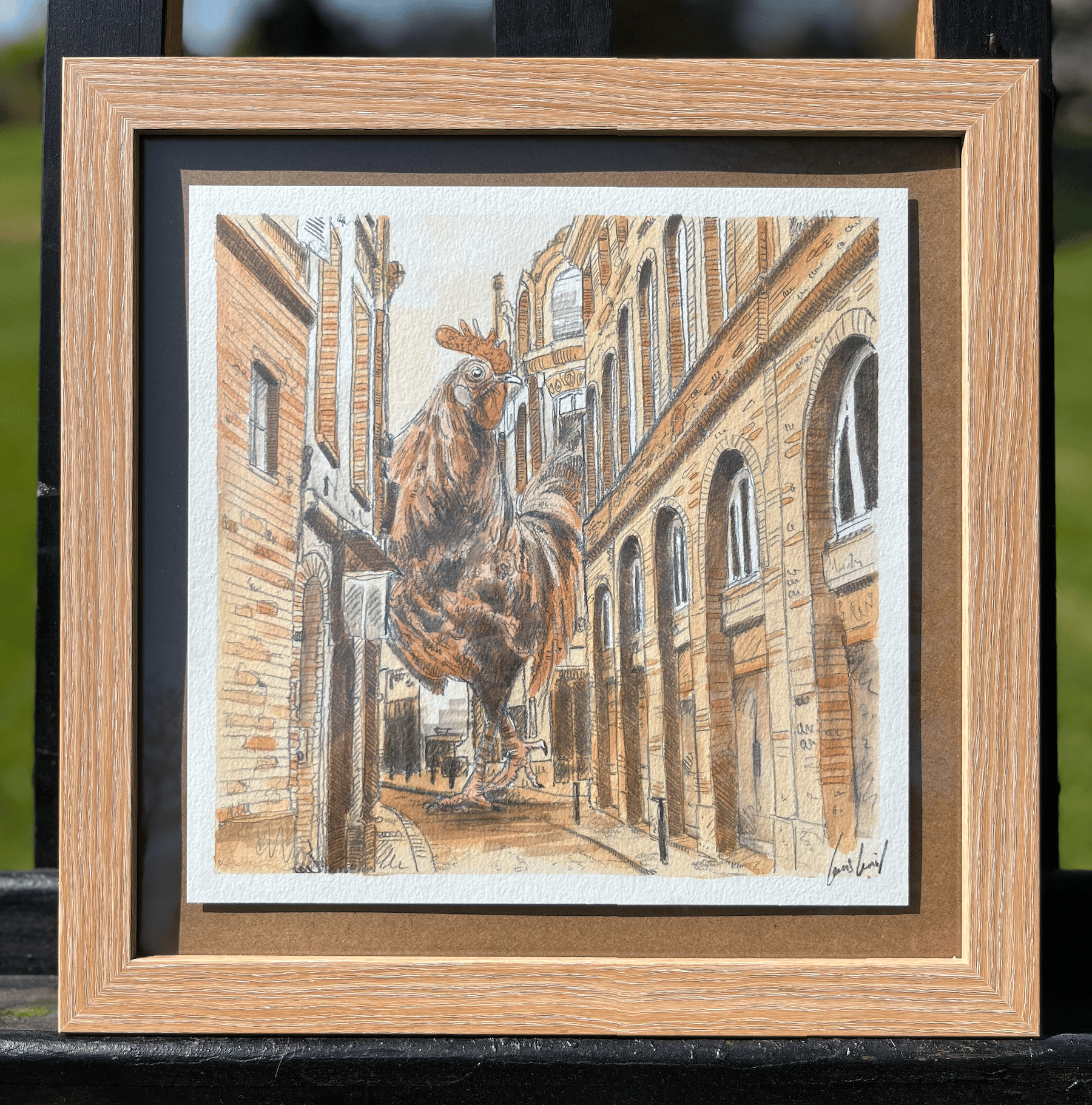 Original handmade artwork in watercolor, pencil, and alcohol marker with glass ans wooden frame.