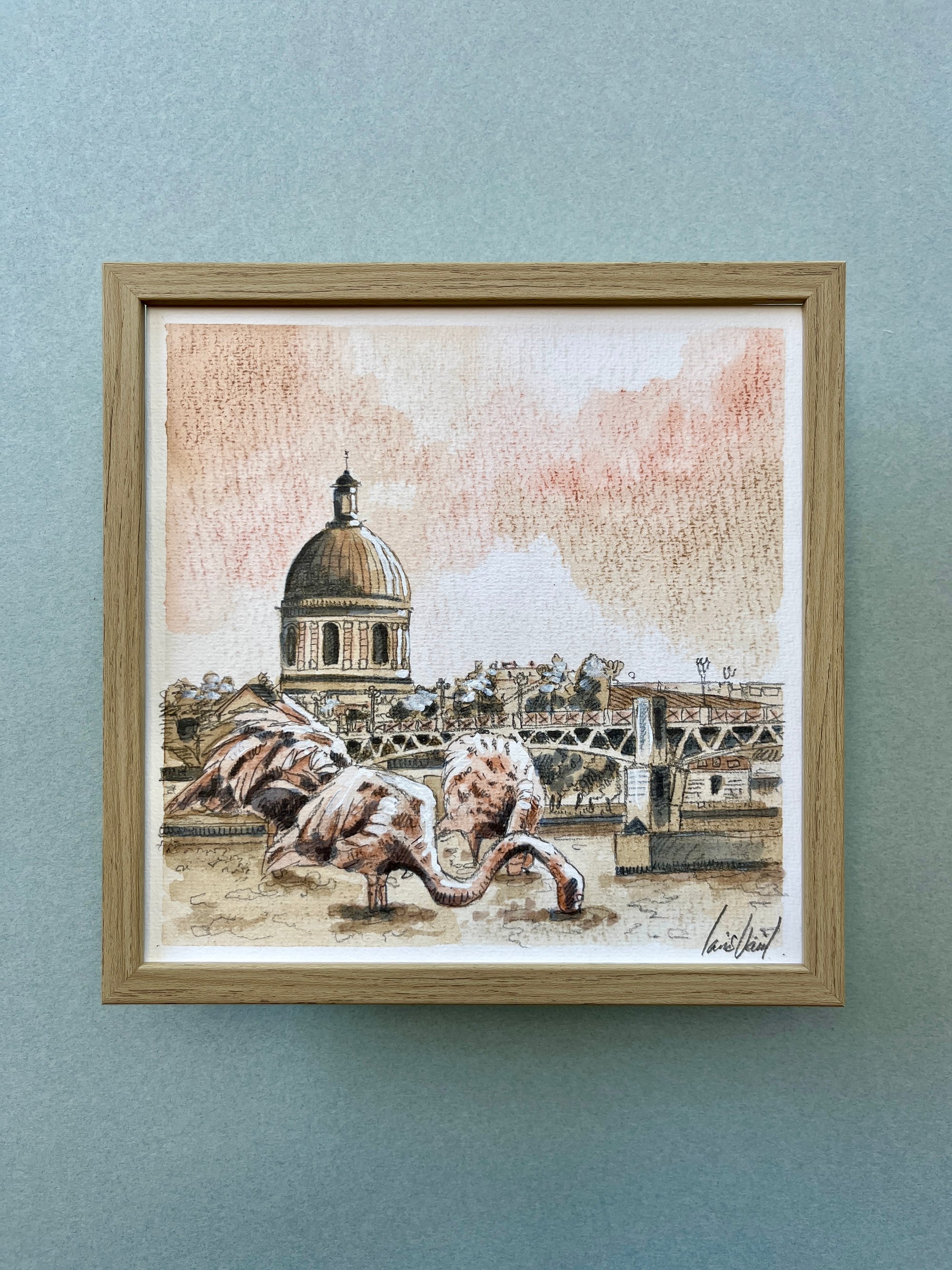 Œuvre originale fait main à l’aquarelle, crayon et feutre alcool avec cadre bois et verre.