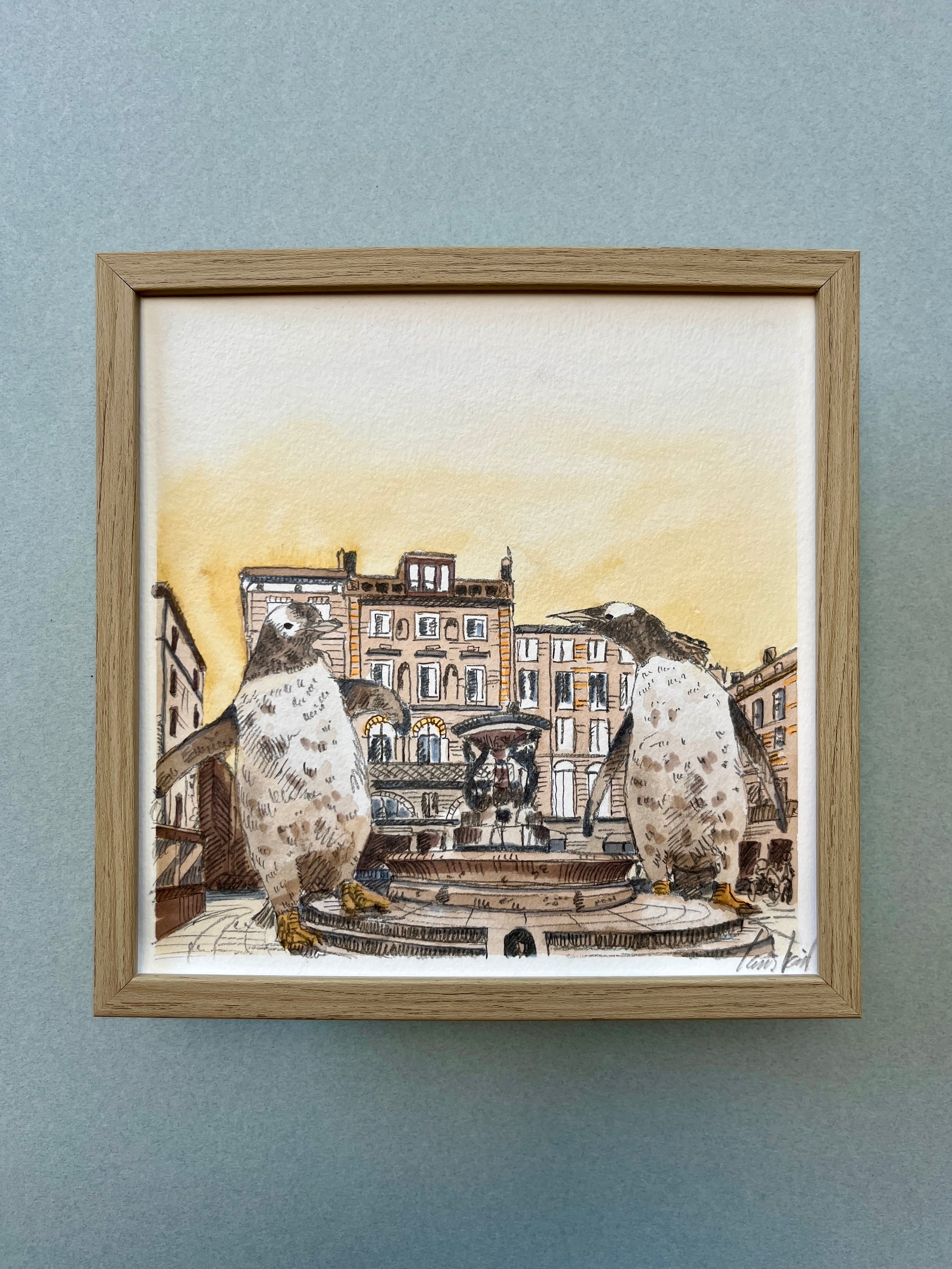 Œuvre originale fait main à l’aquarelle, crayon et feutre alcool avec cadre bois et verre.