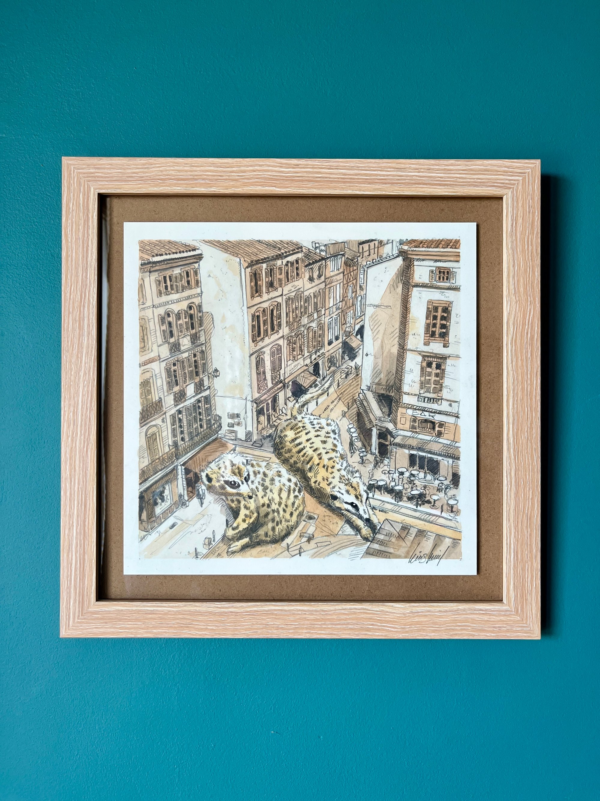 Œuvre originale fait main à l’aquarelle, crayon et feutre alcool avec cadre bois et verre.