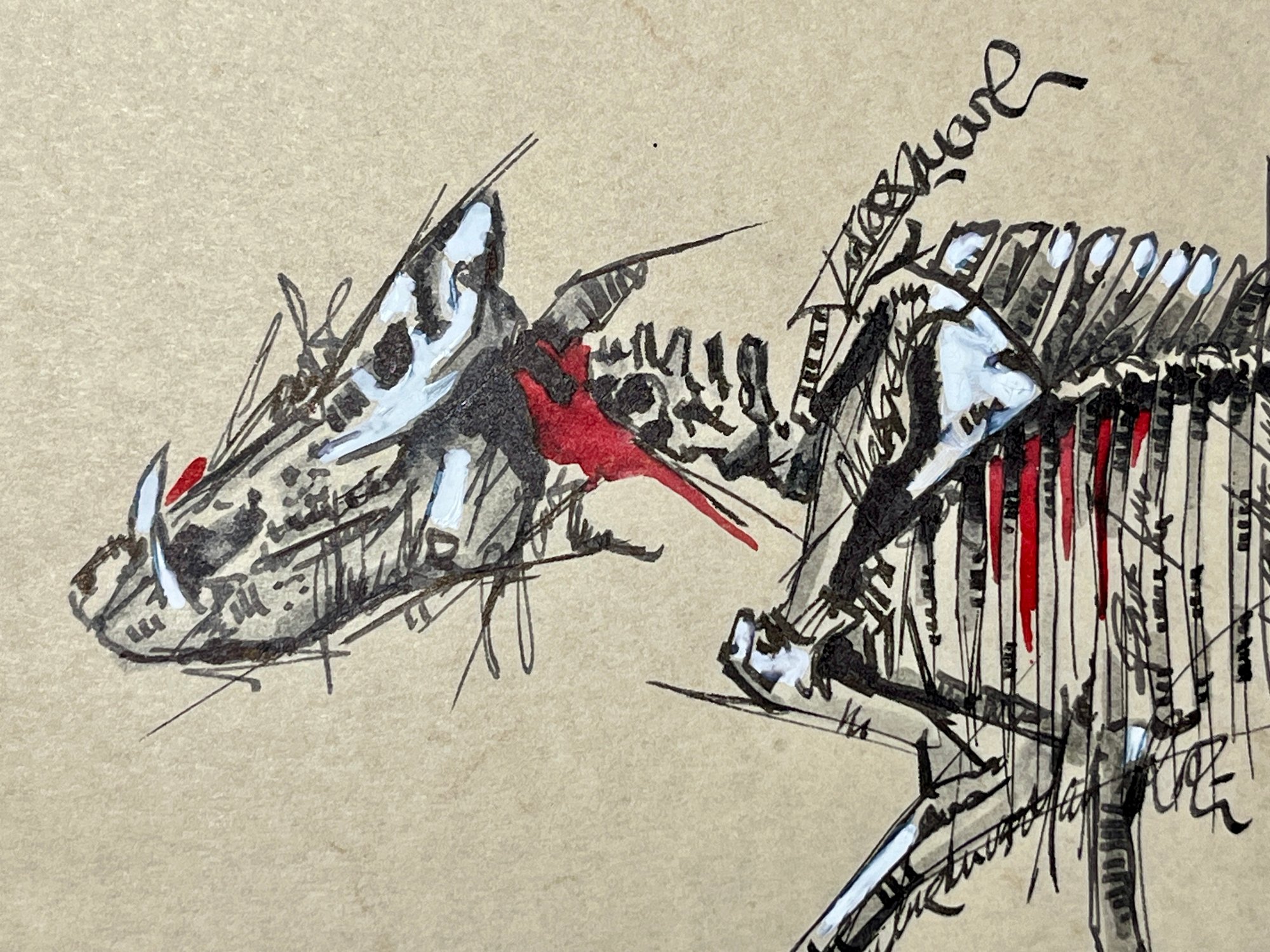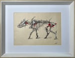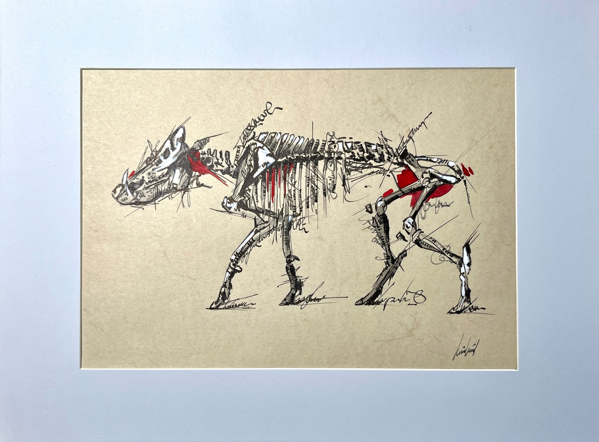 Le Phacochère (Squelette) Œuvre originale fait main à la plume, encre et feutres alcool sur papier à lettre avec cadre bois et verre.